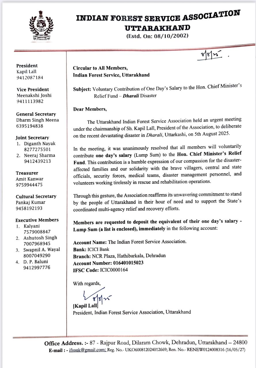 देहरादून,– 5 अगस्त 2025 को धराली, उत्तरकाशी में आई भीषण प्राकृतिक आपदा से गहराई से व्यथित उत्तराखण्ड भारतीय वन सेवा (आईएफ़एस) एसोसिएशन ने सर्वसम्मति से निर्णय लिया है कि एसोसिएशन के सभी सदस्य स्वेच्छा से अपना एक दिन का वेतन माननीय मुख्यमंत्री राहत कोष में प्रदान करेंगे।